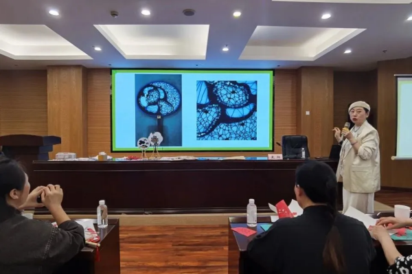 此外,本次培训活动组织了主题讲座与实操体验环节。中央戏剧学院博士、兼任浙江省纺织工程学会可持续发展专业委员会副秘书长屈萍,为学员进行《明代龙凤纹纹样的审美意蕴及演变研究》授课。课上,屈萍老师围绕刺绣针法技巧、色彩搭配的组合与应用等专业知识,结合实际操作,为学员们进行了细致深入的讲解。学员们边听讲解边动手,现场学习氛围浓厚,学员直呼“干货满满!”