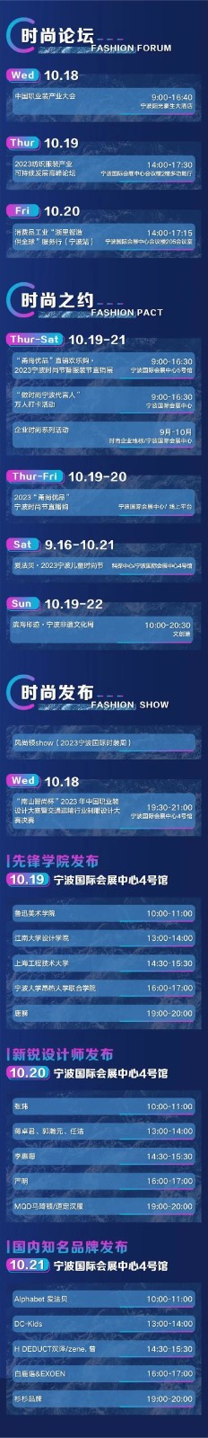 2023宁波时尚节将于2023年10月19日至21日在宁波国际会展中心举行。本届时尚节以“潮涌东方、风尚宁波”为年度主题,设置时尚峰会、时尚展览、时尚论坛、时尚发布、时尚之约等五大系列活动,以时尚赋能城市,以产业拥抱未来,搭建时尚产业全链条的专业商贸及交流平台,打造具有城市影响力和行业创造力的时尚行业会展品牌。